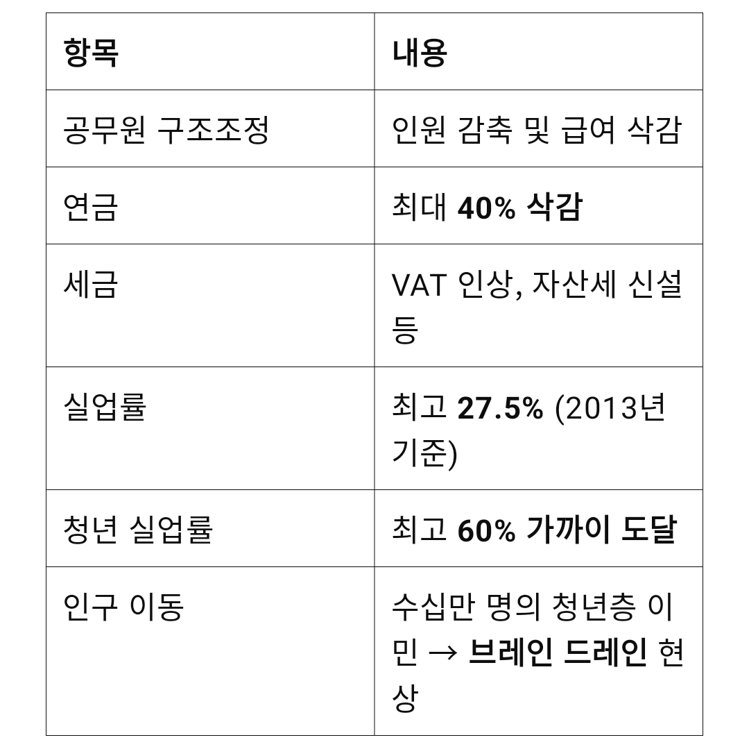 그리스 시민들은 복지 축소 + 세금 폭탄 + 실업 증가라는 3중고를 겪었습니다.