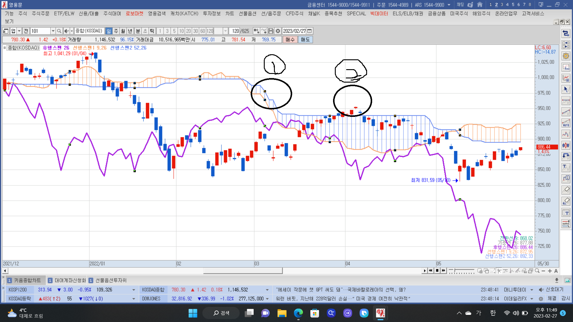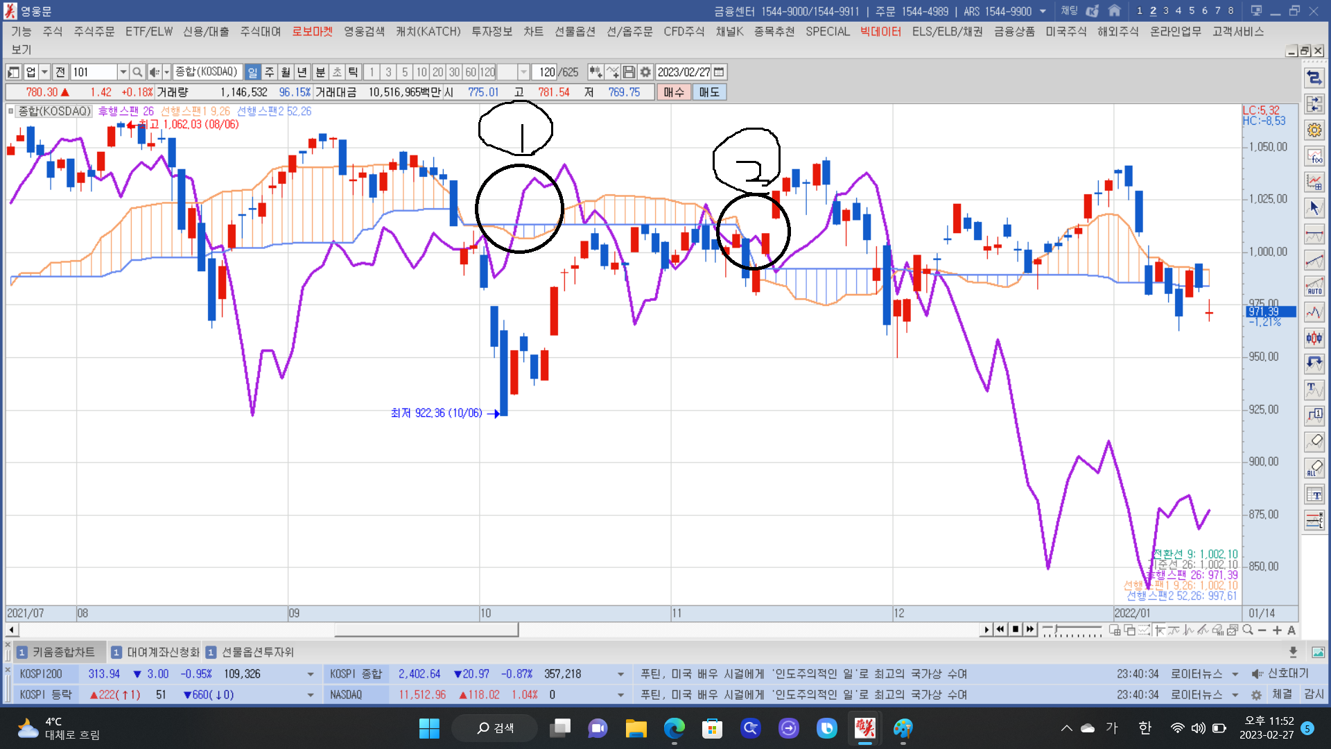 1번에서 후행스팬, 내캔들 모두 빗각이니 뚫고 상승하였다.