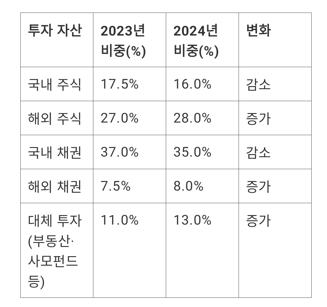 하지만 최근 들어 국내 주식 비중을 줄이고, 해외 주식과 대체 투자 비중을 늘리는 모습을 보이고 있어요.