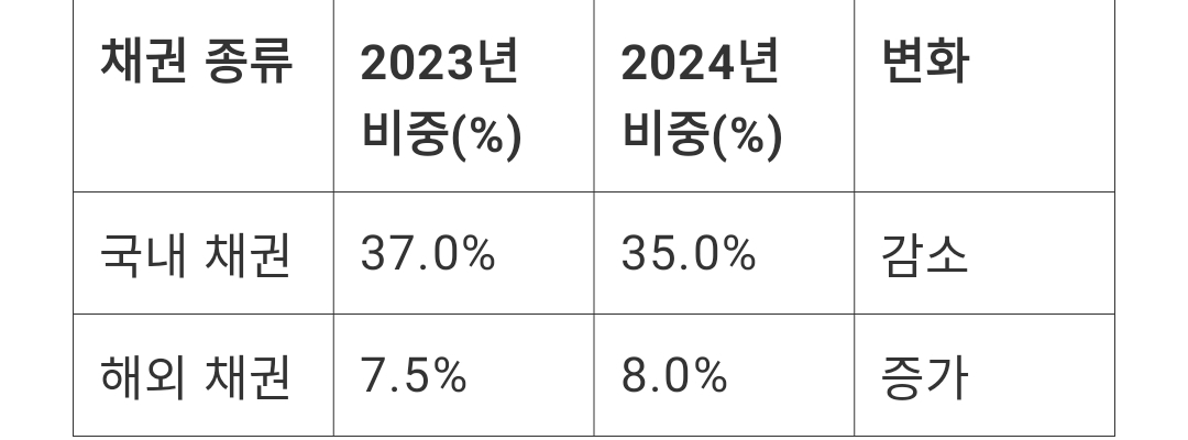 국민연금은 해외 채권 비중을 늘리고, 국내 채권 비중을 줄이는 중이에요.