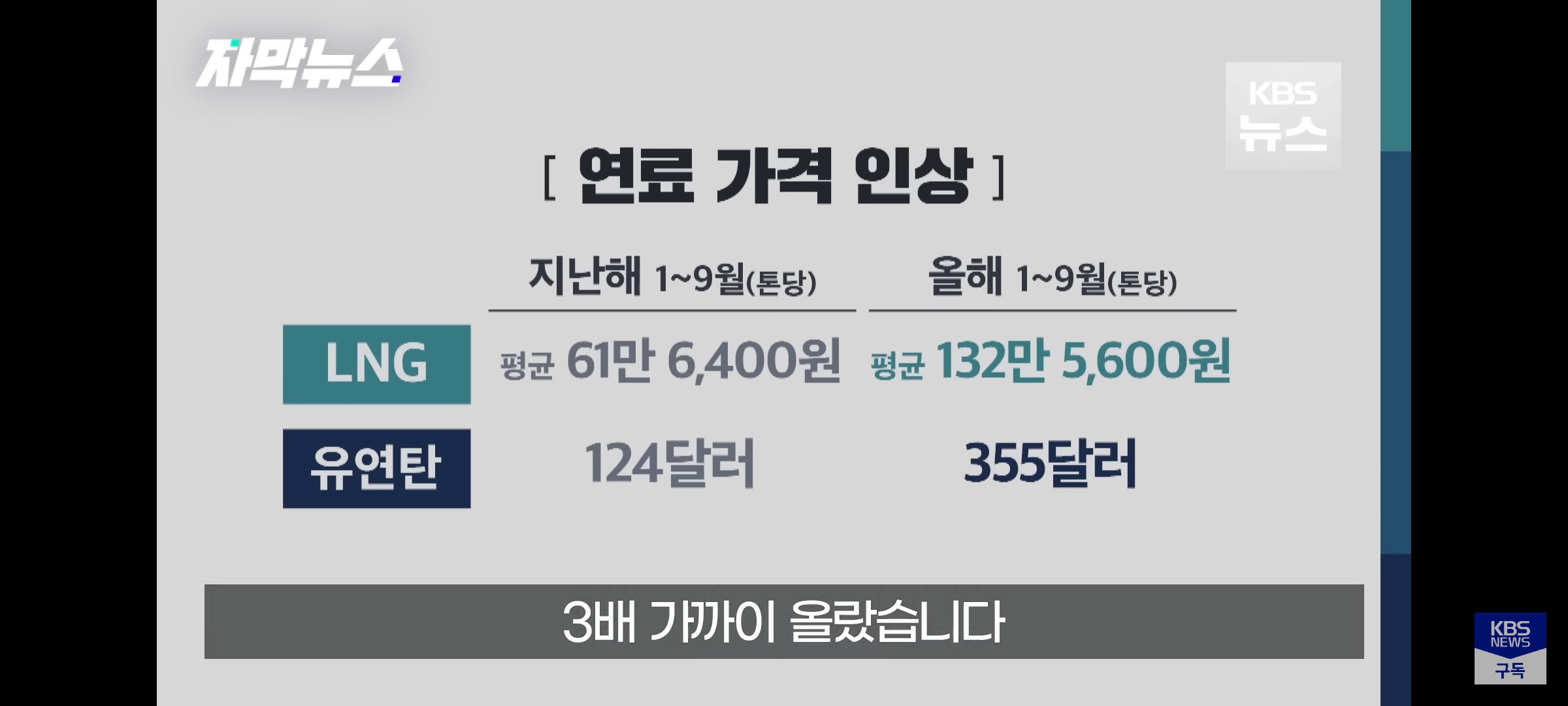 연료가 아주많이 올랐지만, 전기료는 조금밖에올리지못해서 한전은 지금 몇십조의 적자상태이다.