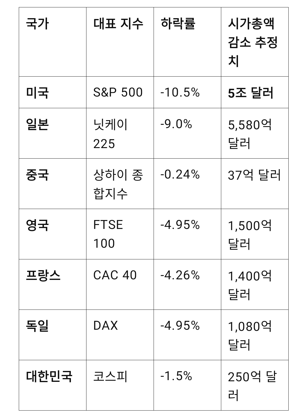 → 합계 약 6.4조 달러, 환율 1,450원 기준 9,280조 원 규모의 시가총액이 증발한 셈입니다.