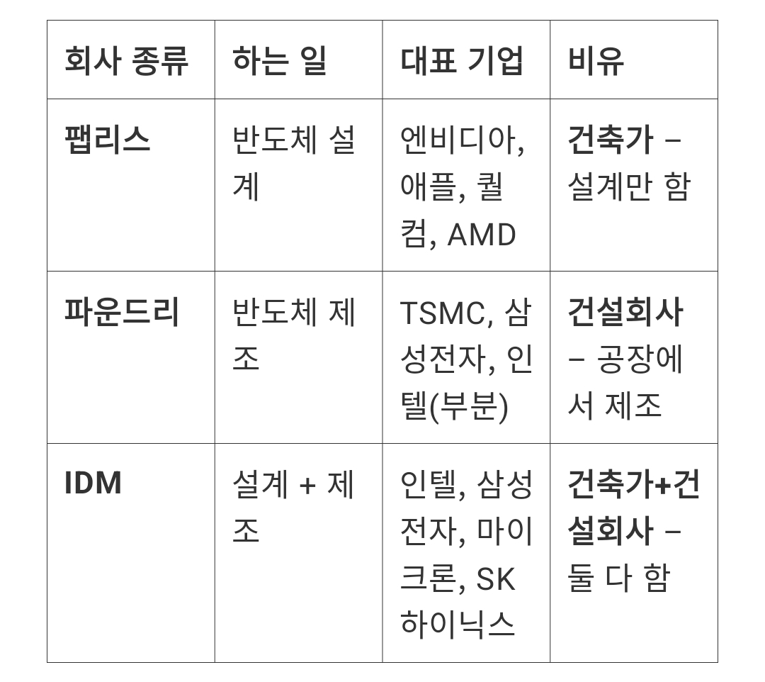 ✔ 반도체 회사는 팹리스(설계), 파운드리(제조), IDM(설계+제조) 세 가지로 나뉜다.