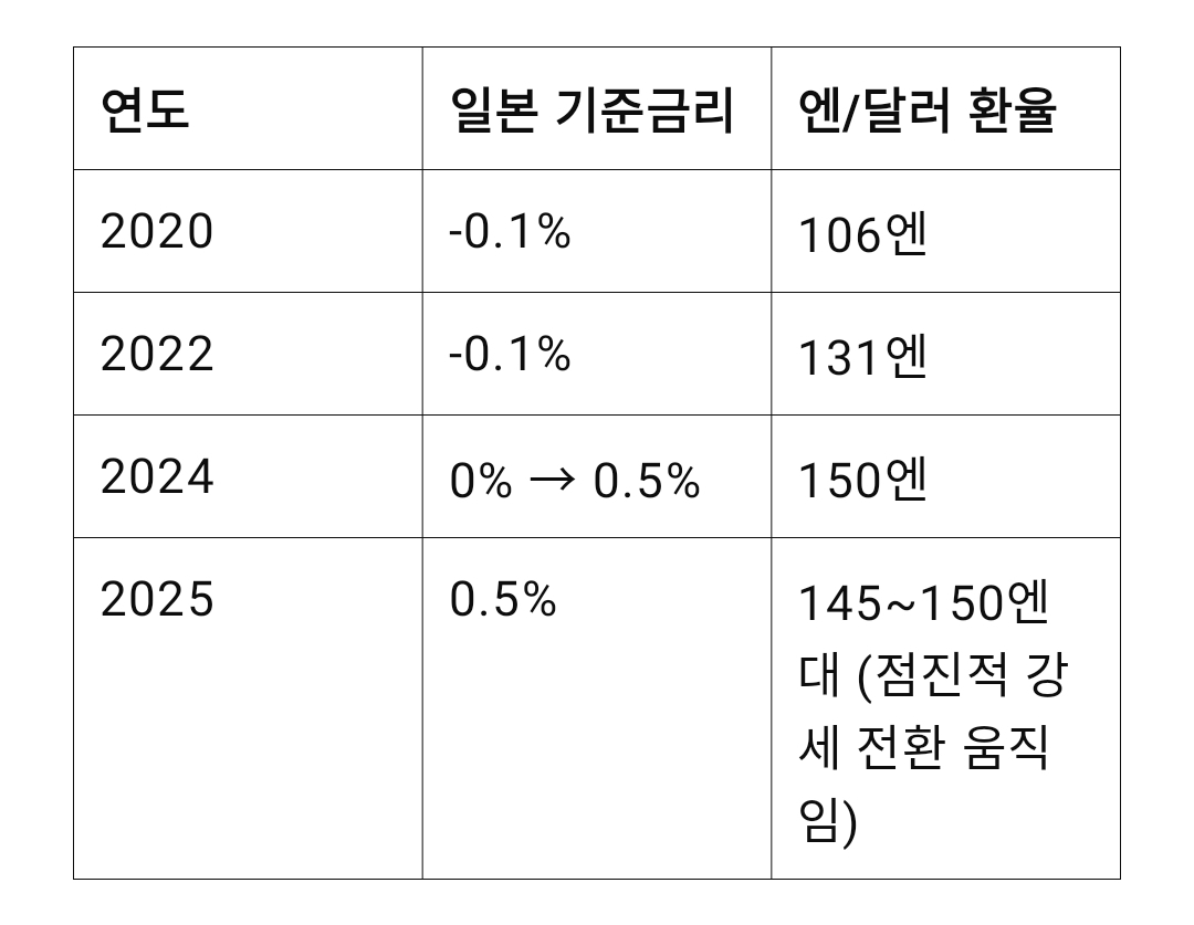 특히 2022~2024년, 미국은 기준금리 5%대, 일본은 0% → 금리 격차 역대 최고.