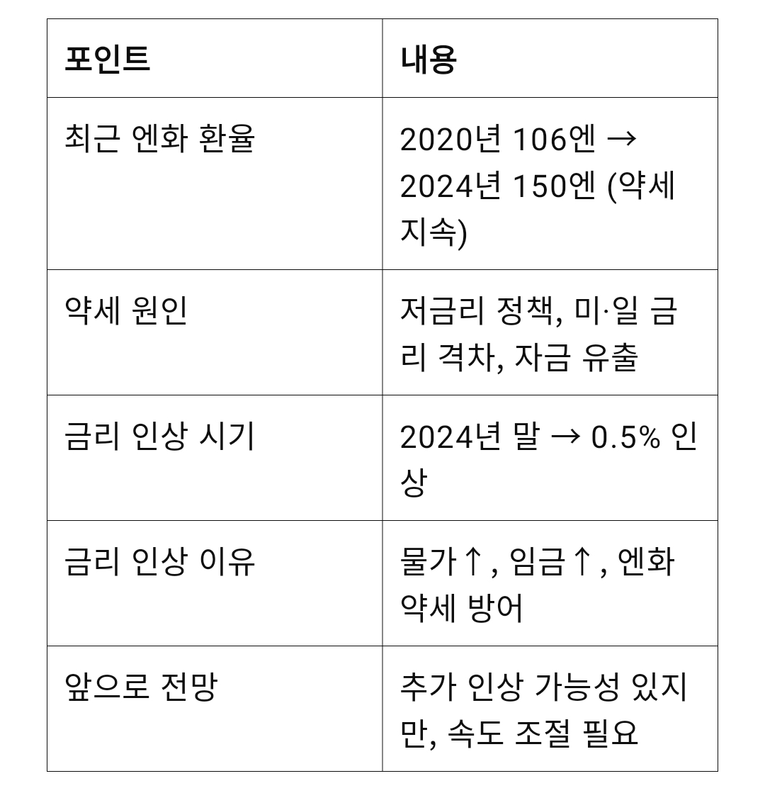 엔화 약세 → 수입 비용 급증 → 국내 물가 자극.