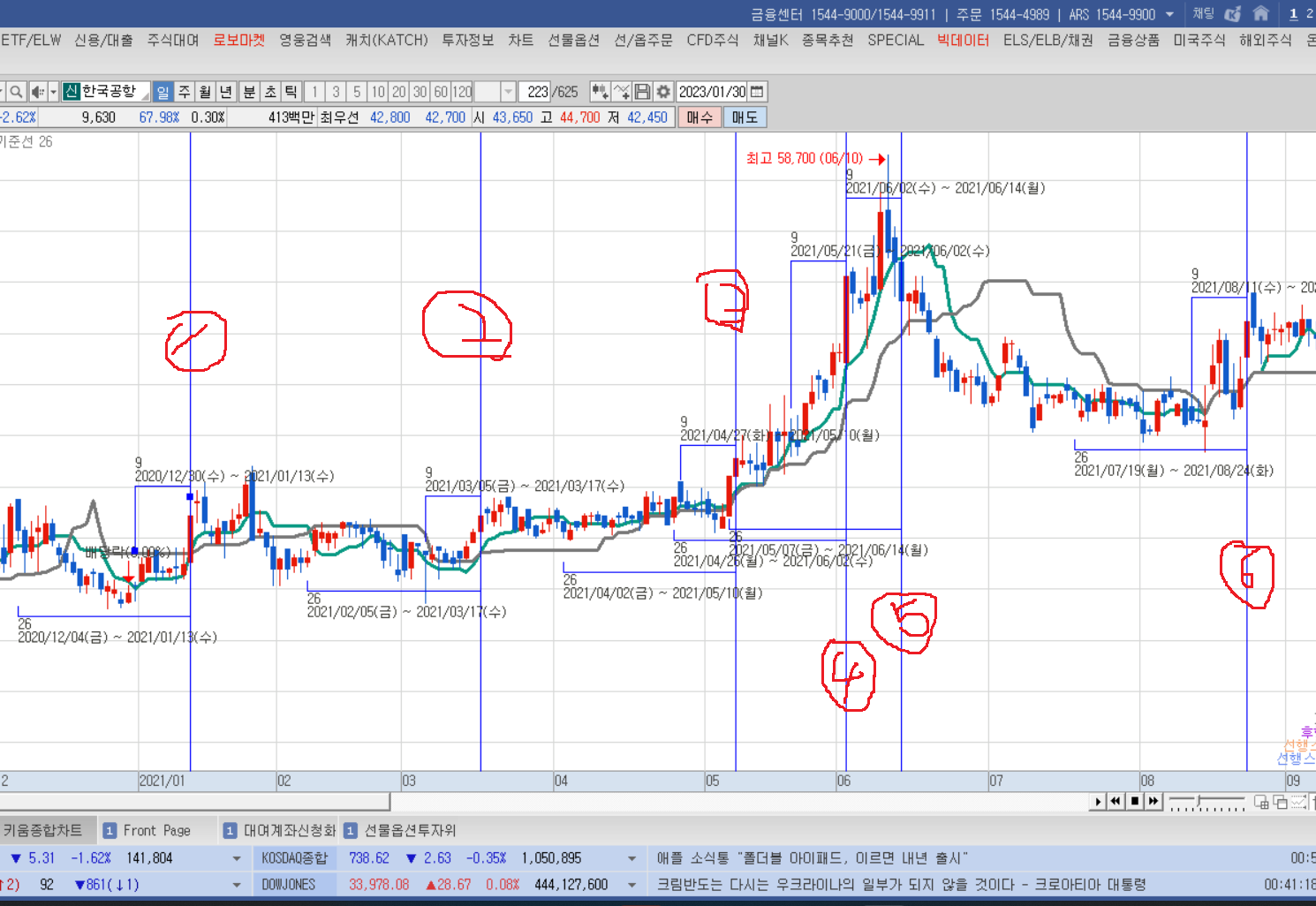 0점짜리 기준선이나올때, 전환선이 상승하면 하락추세에서 상승추세로 변화됨을 볼수있다.
