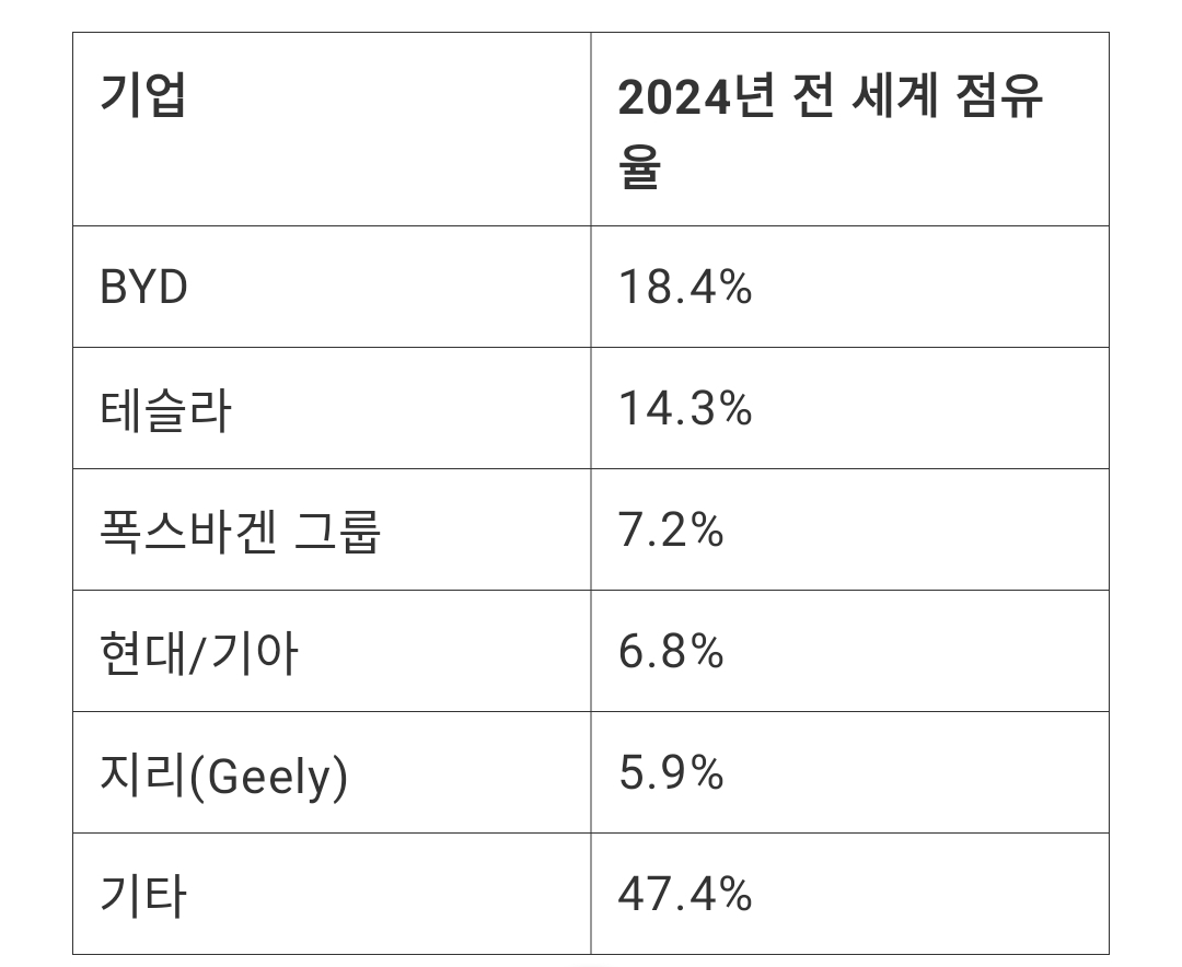 현재 글로벌 전기차 시장 점유율을 보면 더욱 명확합니다.