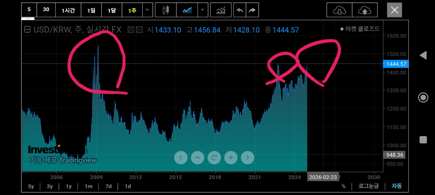 그래프를 보면 2008년에 원달러 환율이 1500원을 넘어섰음을 볼수있고,