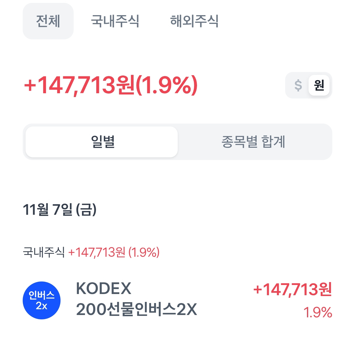 ​긍정적인 점: 11월 7일에 국내 주식(KODEX 200선물인버스2X)에서 147,713원의 판매 수익을 실현하여 일부 현금 흐름을 확보했습니다.