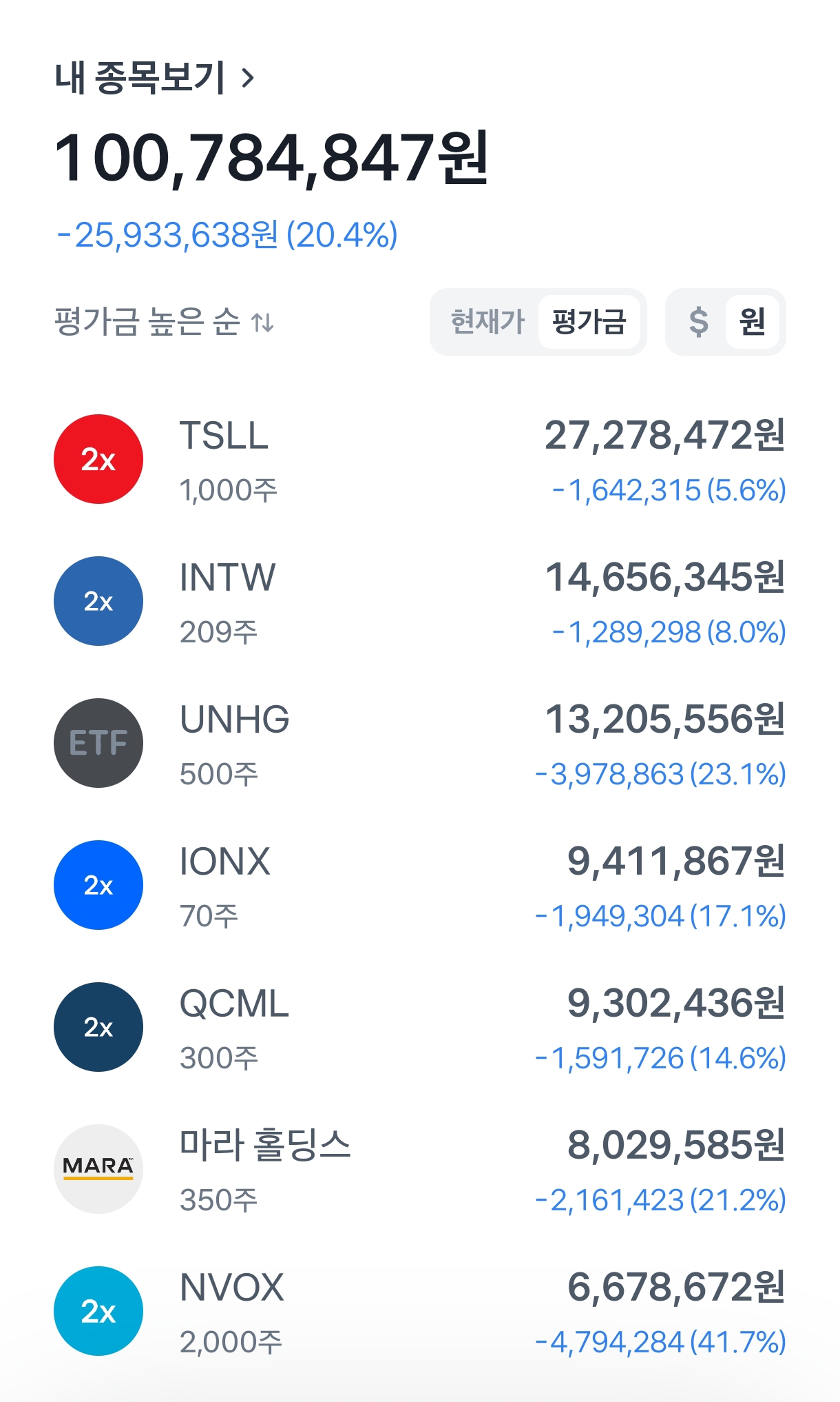 ​현재 포트폴리오는 **총 -20.4%**의 평가손실을 기록하며 비교적 큰 폭의 하락세를 보이고 있습니다. 특히 NVOX와 MSTU에서 높은 손실률을 나타내고 있습니다.