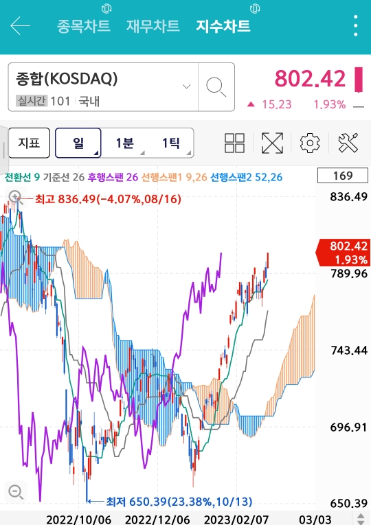 지금 삼전은 선행스팬1이 꺽이면서 하락하고있다.