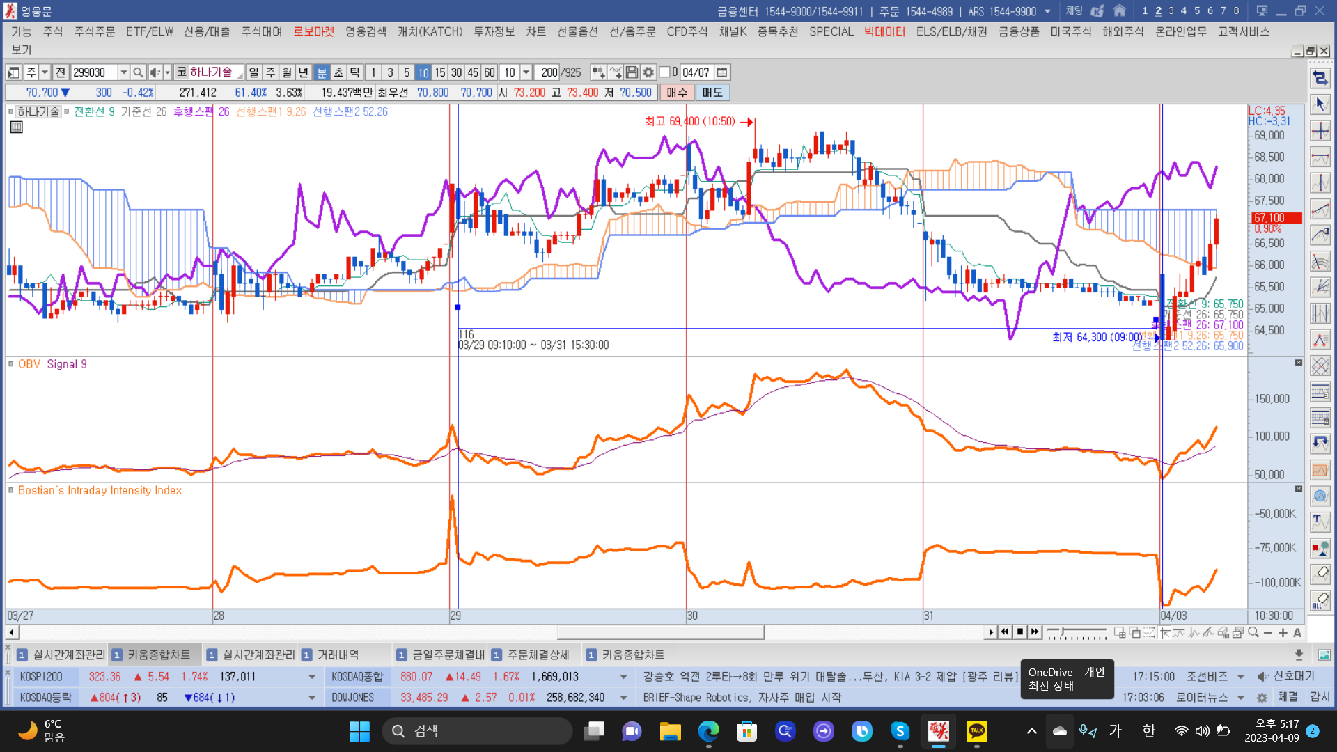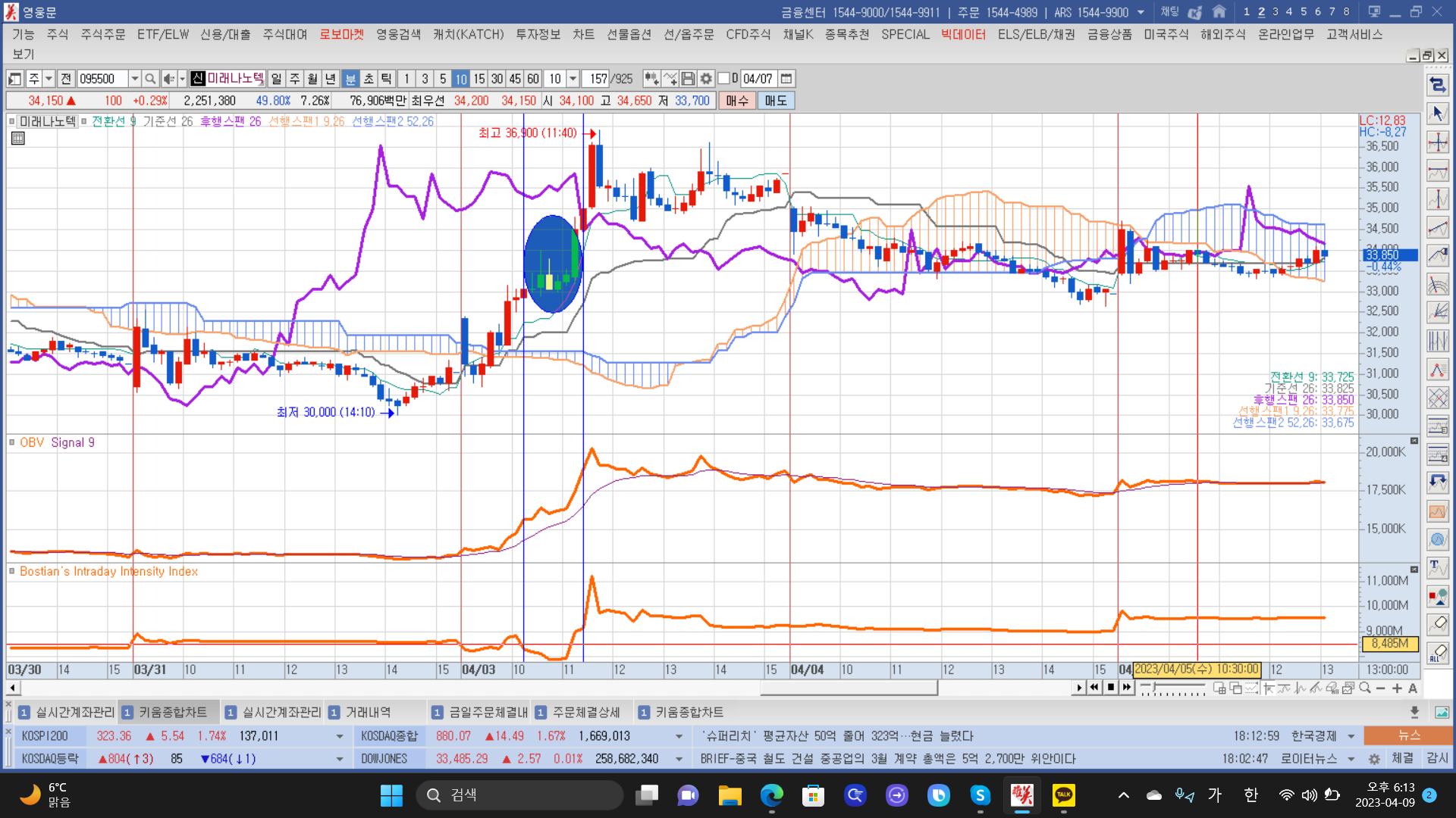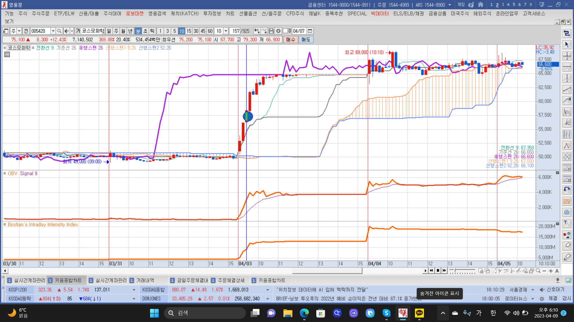 기준선이 떨어지면서 전환선이 상승하는 10일신고가여서 샀으나, obv가 데드크로스나서 매도