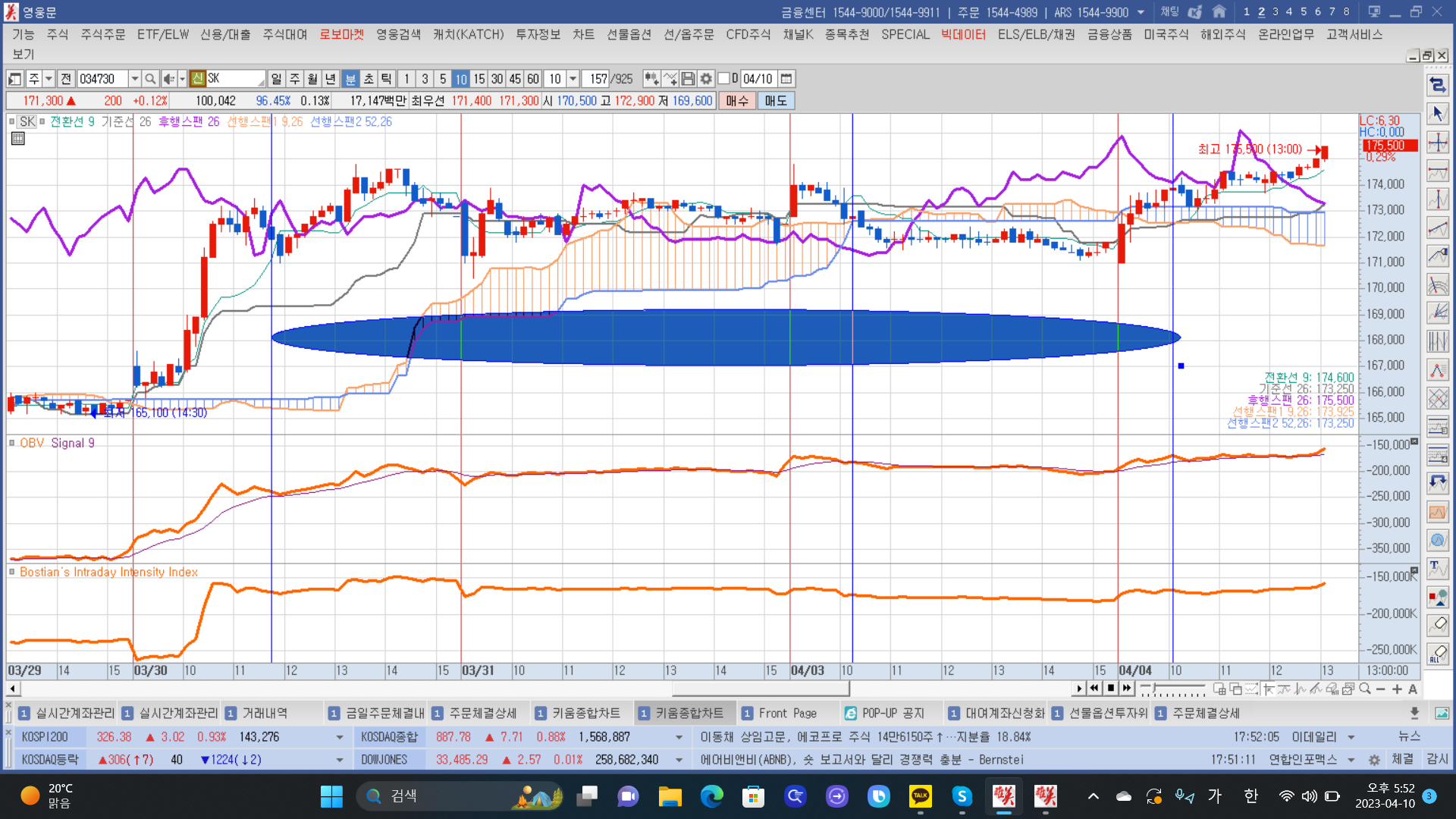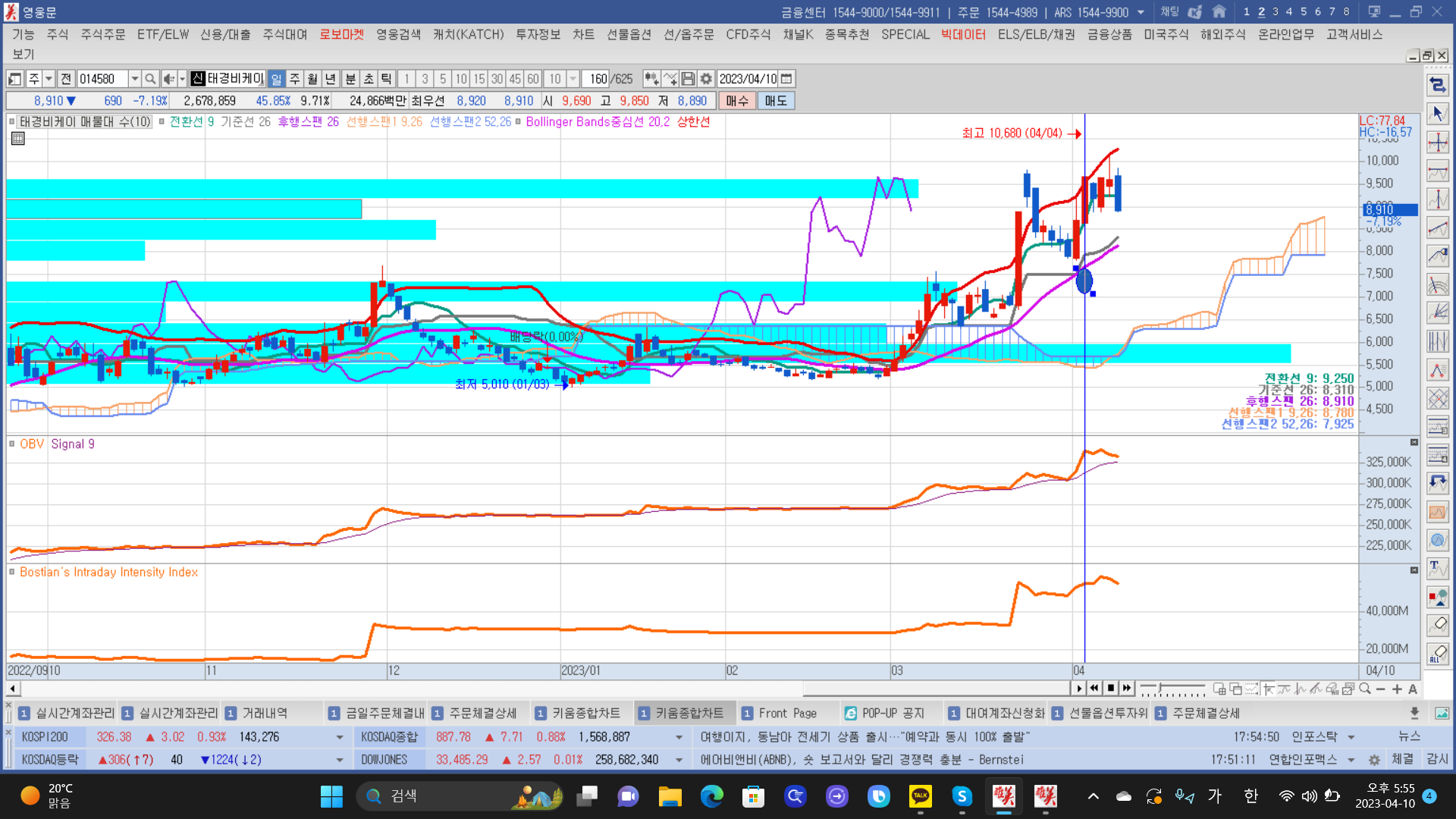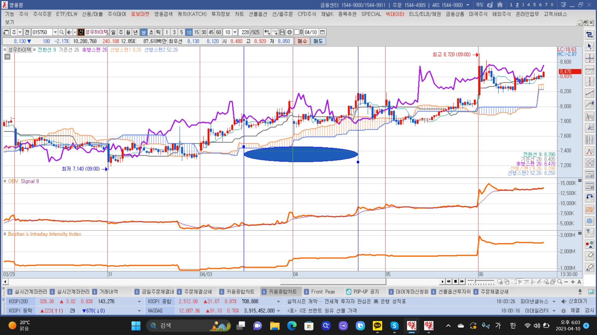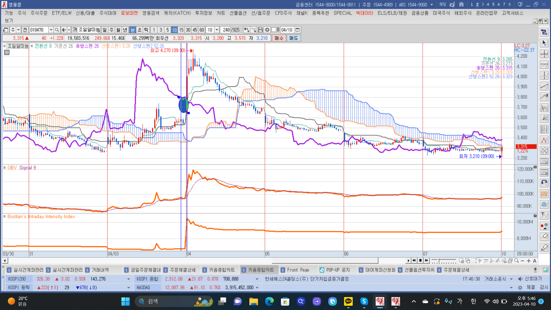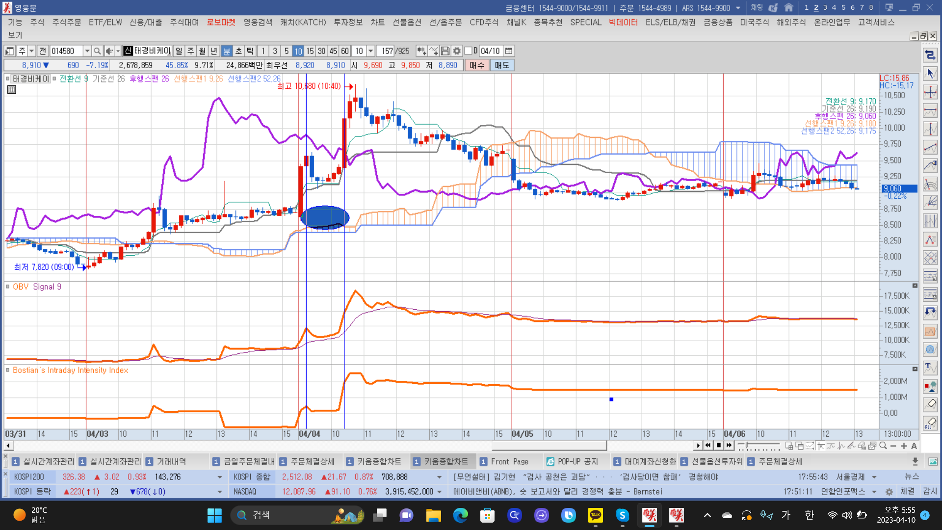 기준선 하락, 전환선상승, 10일신고가, obv골드크로스