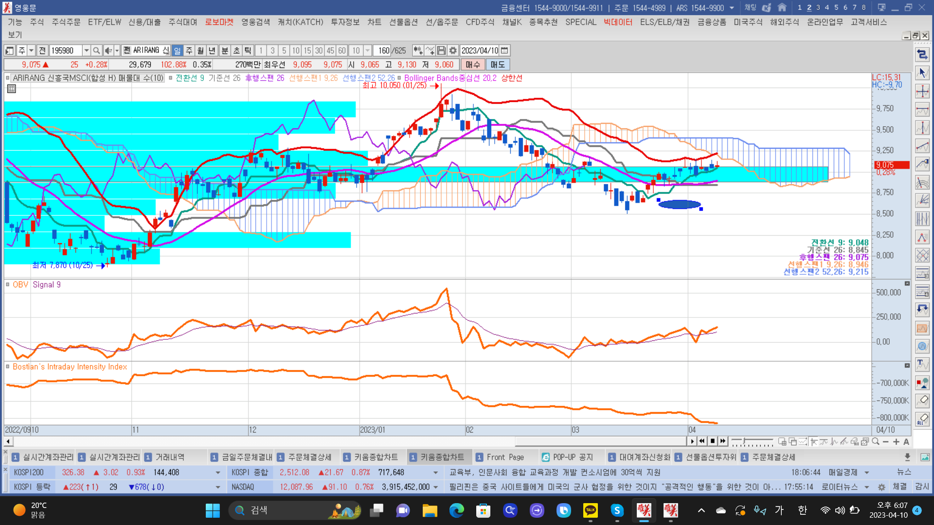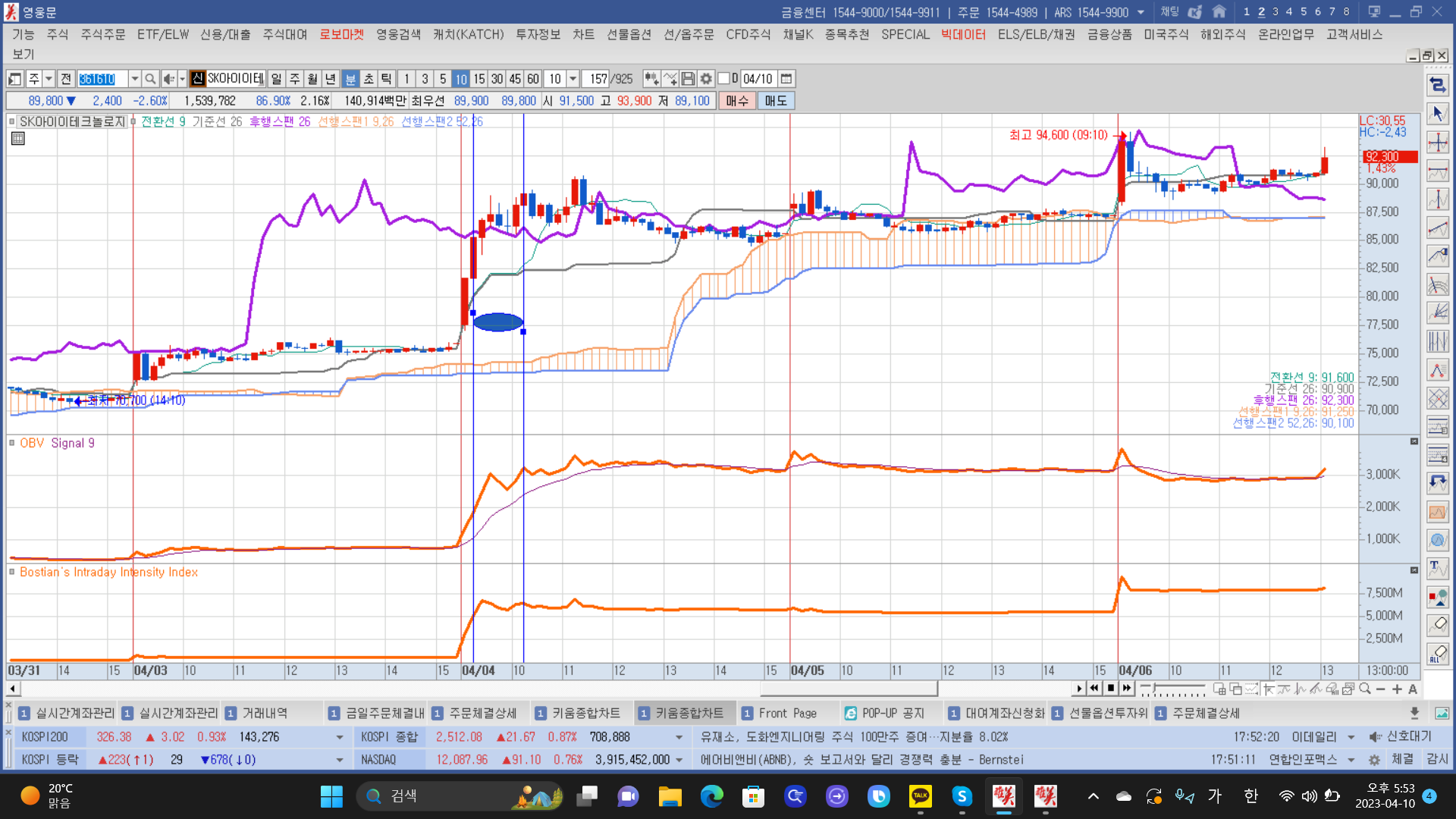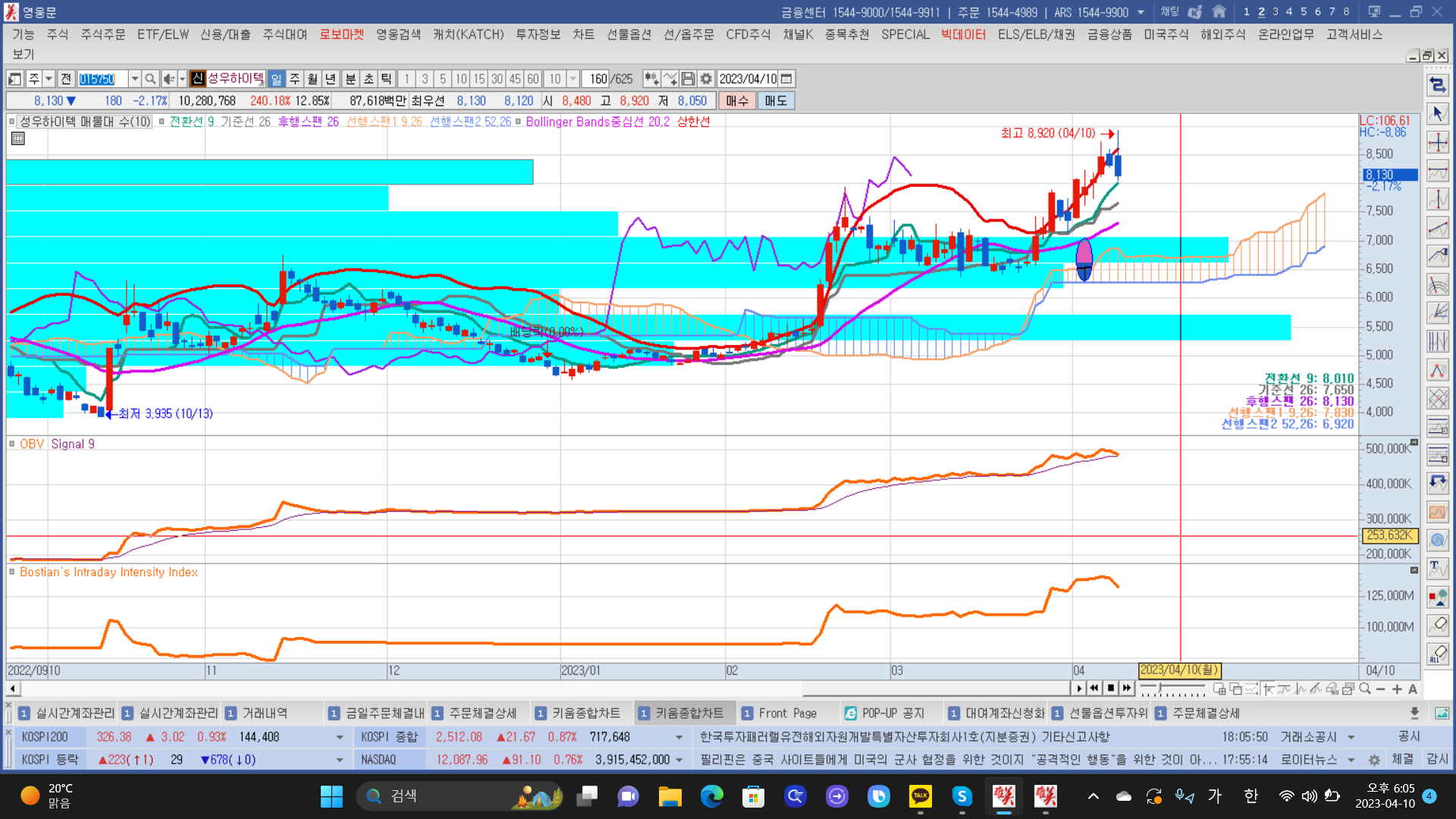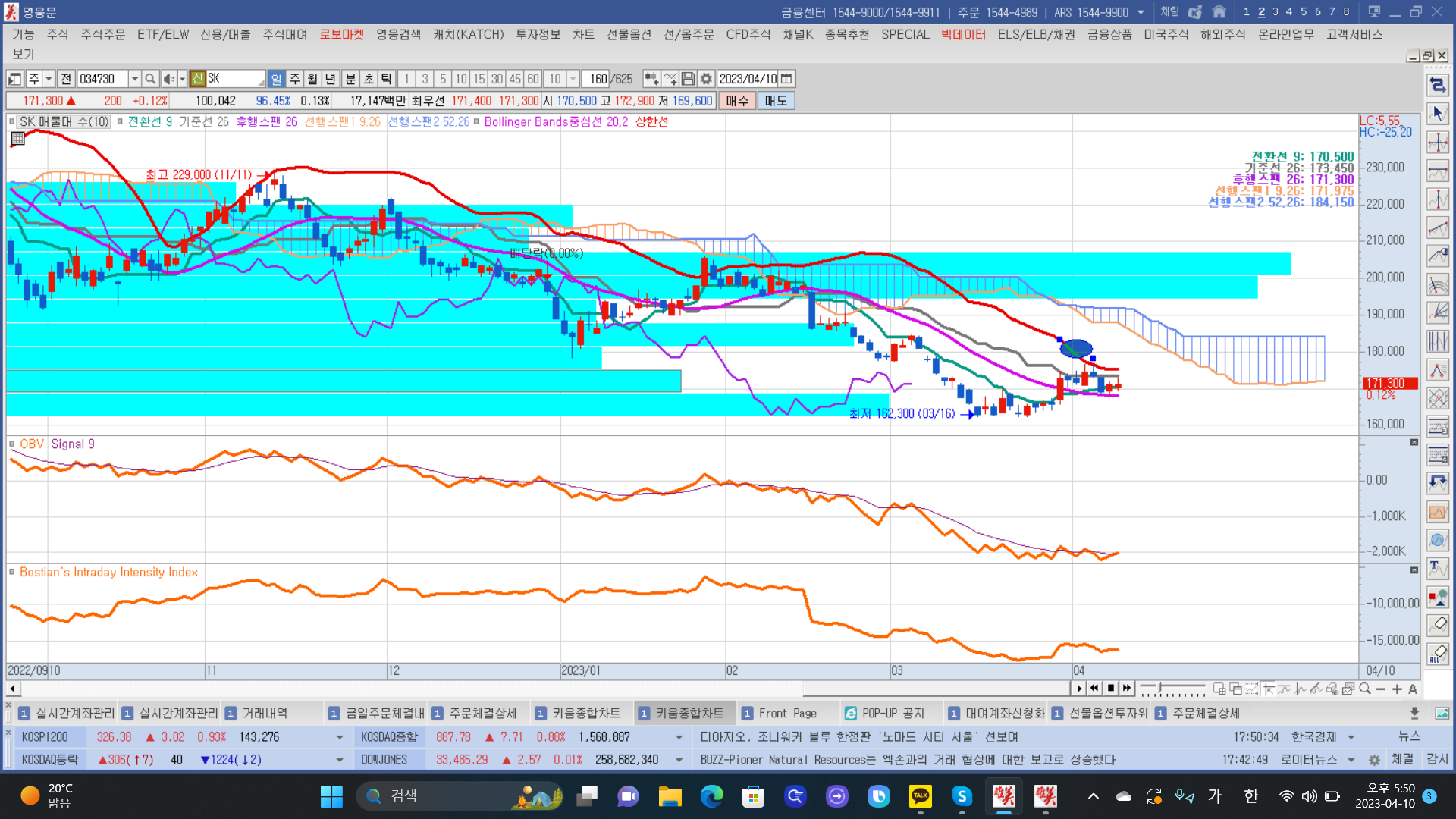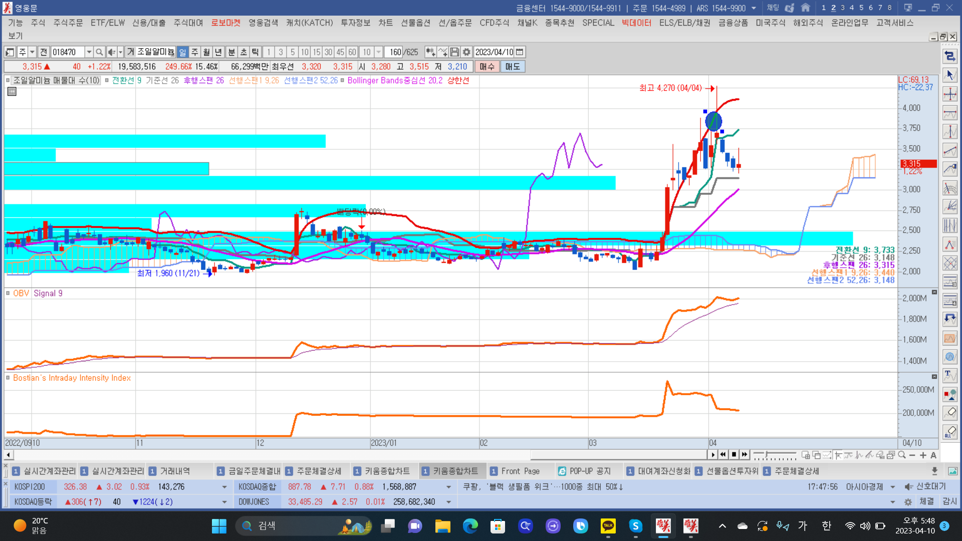 기준선 하락, 전환선상승, 10일신고가, obv골드크로스