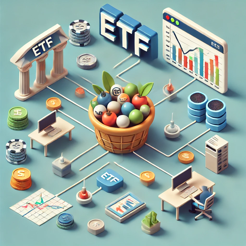 ETF는 쉽게 말하면 **여러 개의 주식을 한 번에 묶어서 거래할 수 있는 "패키지 주식"**입니다. 개별 주식을 하나하나 사지 않아도, ETF 하나만 사면 자동으로 여러 기업에 투자하는 효과를 얻을 수 있죠.