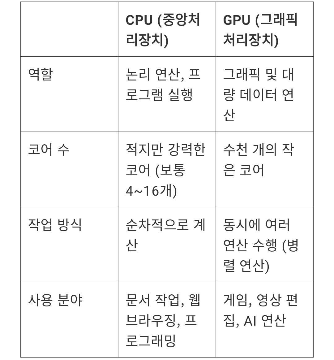 그래서 게임, 그래픽, 인공지능 같은 대량 연산 작업에서 GPU가 강력한 성능을 발휘한다.
