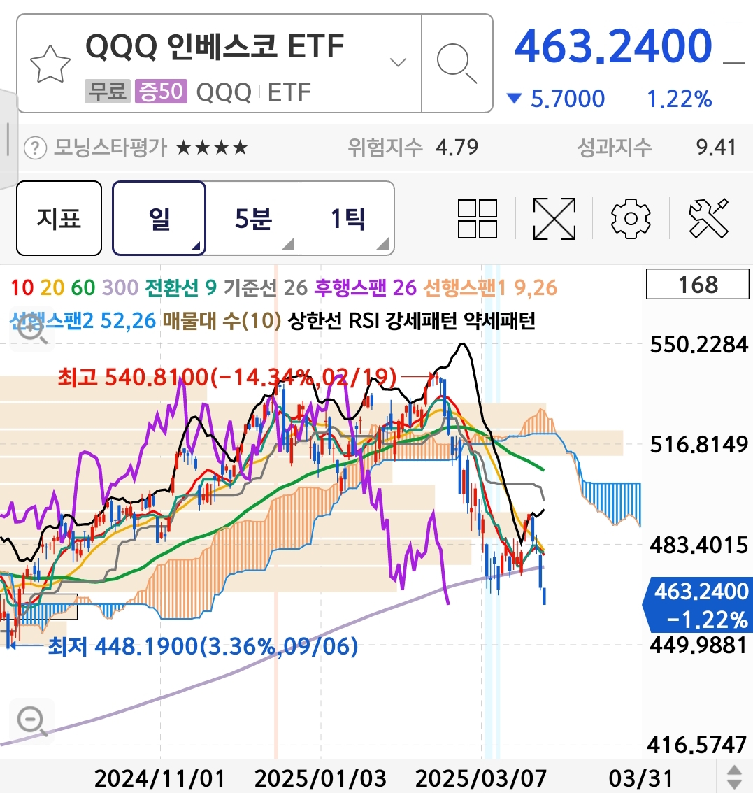 오늘은 나스닥 100 지수를 추종하는 QQQ 인베스코 ETF를 일목균형표와 300일 이동평균선 중심으로 분석해보려 합니다.
