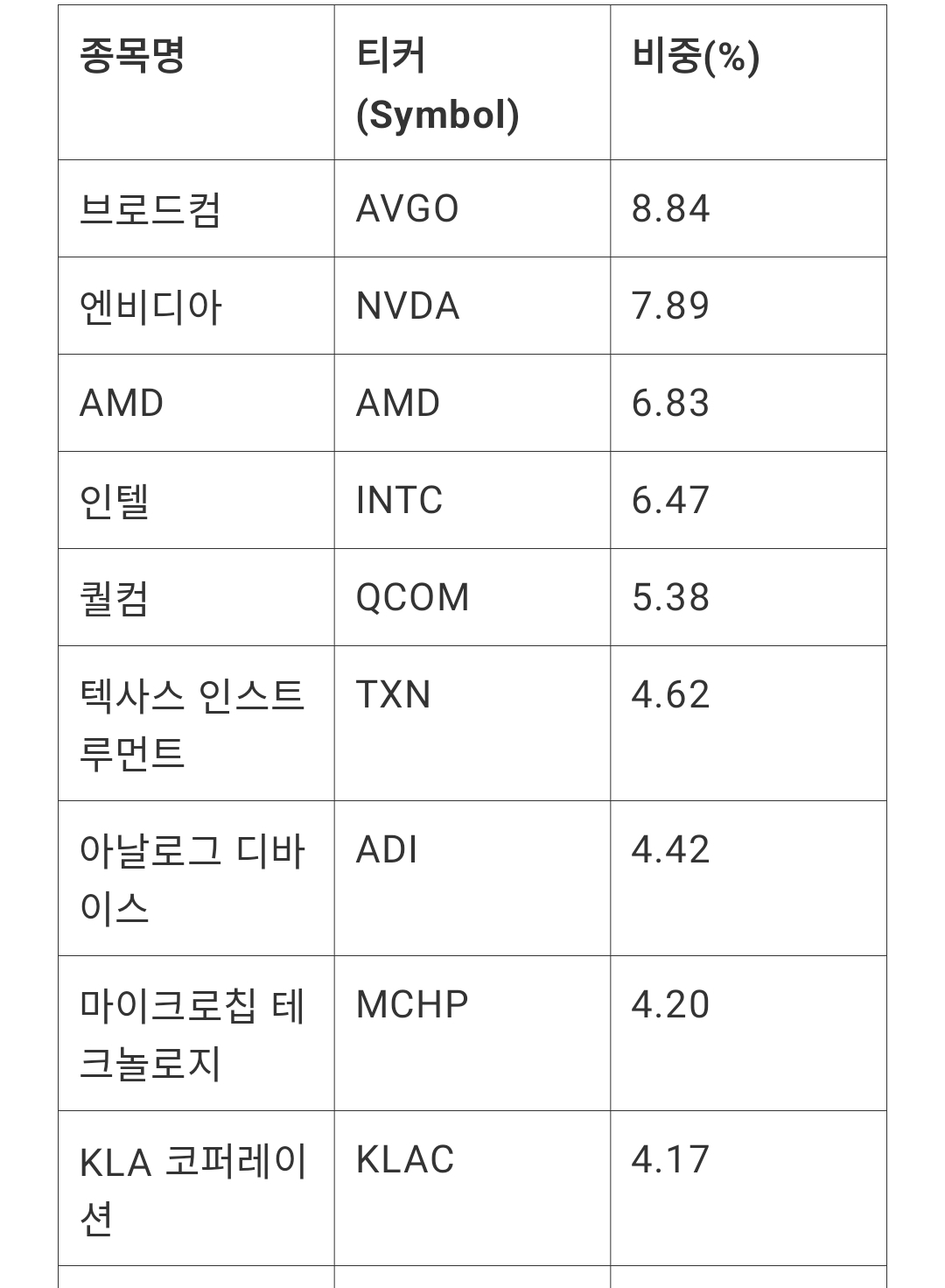 아래 표를 보면 SOXL에 담긴 종목과 그 비중을 한눈에 확인할 수 있다.