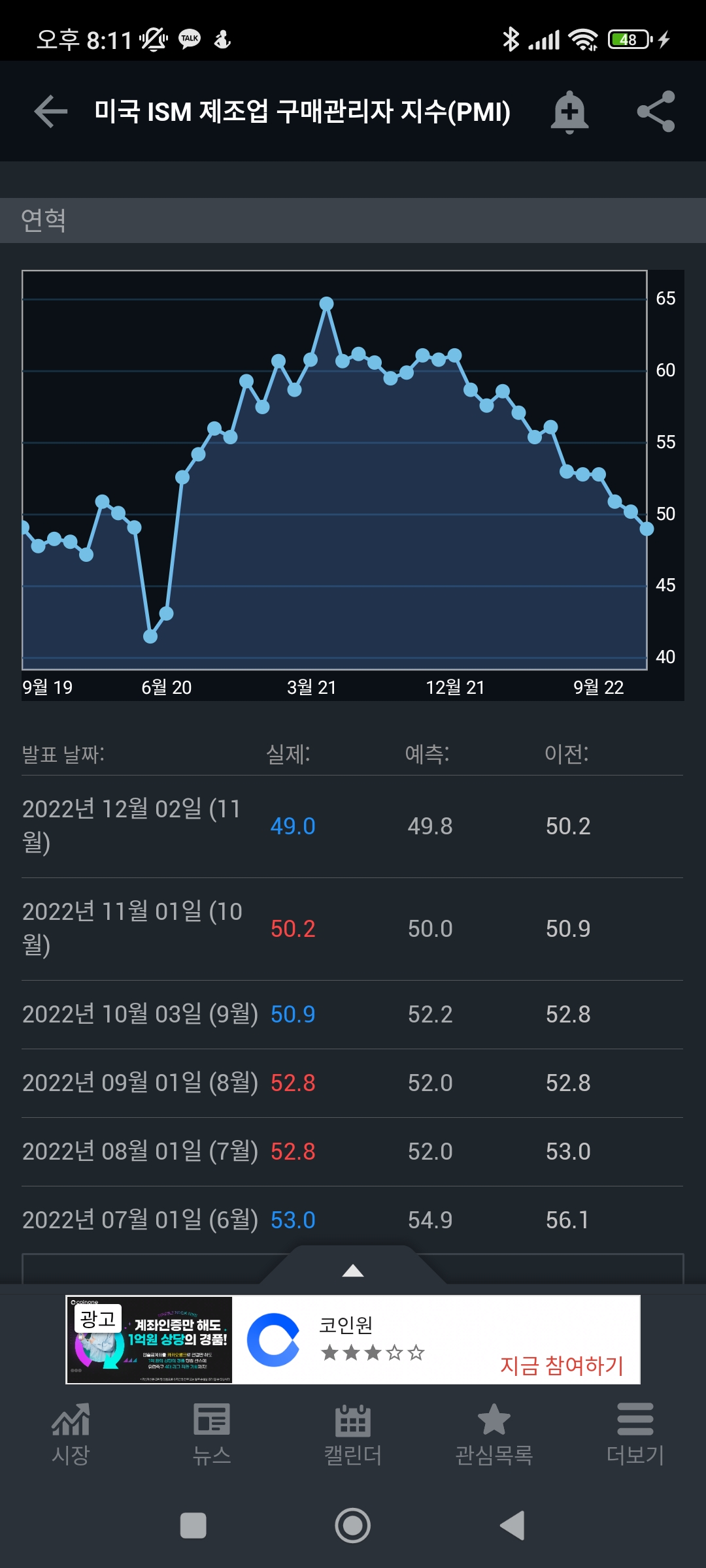 시장이 예상한 49.8보다 더 적은 수치가 나왔기에